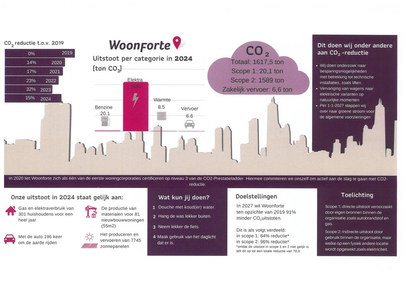 Woonforte heeft meer dan 11.000 woningen in beheer. Dat betekent dat we met elkaar veel kunnen besparen. Elk jaar willen we minder CO₂ uitstoten dan het jaar ervoor. Doet u ook mee met deze energiebesparing? Alle kleine beetjes helpen.