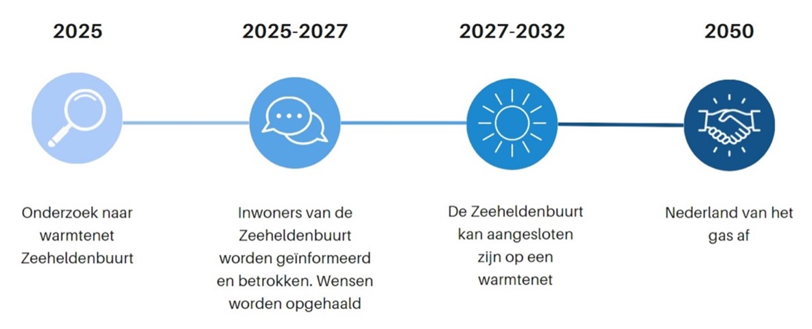 In het plaatje hieronder ziet u de tijdlijn voor de Zeeheldenbuurt. Zo krijgt u een beter beeld van het project. Maar er kunnen nog dingen veranderen en dit gaat tijd kosten. Het ontwikkelen van een warmtenet is ingewikkeld. Het is zelfs mogelijk dat het niet doorgaat.