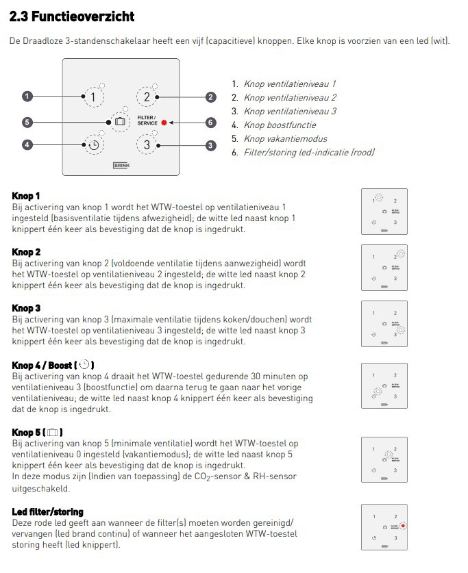 Stand 1 is de auto-stand - deze is de basisstand. Tijdens het koken kunt u de stand in de woonkamer tijdelijk op stand 3 zetten of de timer-stand gebruiken. Met de timer gaat de ventilatie na 30 minuten terug naar stand 1.